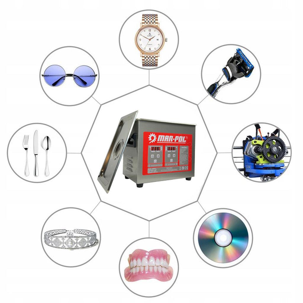 Utilizarea curățătorilor cu ultrasunete permite curățarea suprafețelor greu accesibile, cum ar fi diferite tipuri de capete sau unelte cu forme complexe, carburatoare și multe altele. Când se utilizează lichidul corespunzător, curățatorii cu ultrasunete sunt potriviti pentru dezinfectarea tuturor tipurilor de obiecte! Ce să folosiți într-un aparat de curățat cu ultrasunete? Într -un aparat de curățare cu ultrasunete trebuie utilizați numai agenți de curățare proiectați pentru curățarea cu ultrasunete . Astfel de agenți nu sunt inflamabili și sunt cel mai adesea soluții apoase Proprietățile dispozitivului:- Posibilitatea setarii timpului de lucru