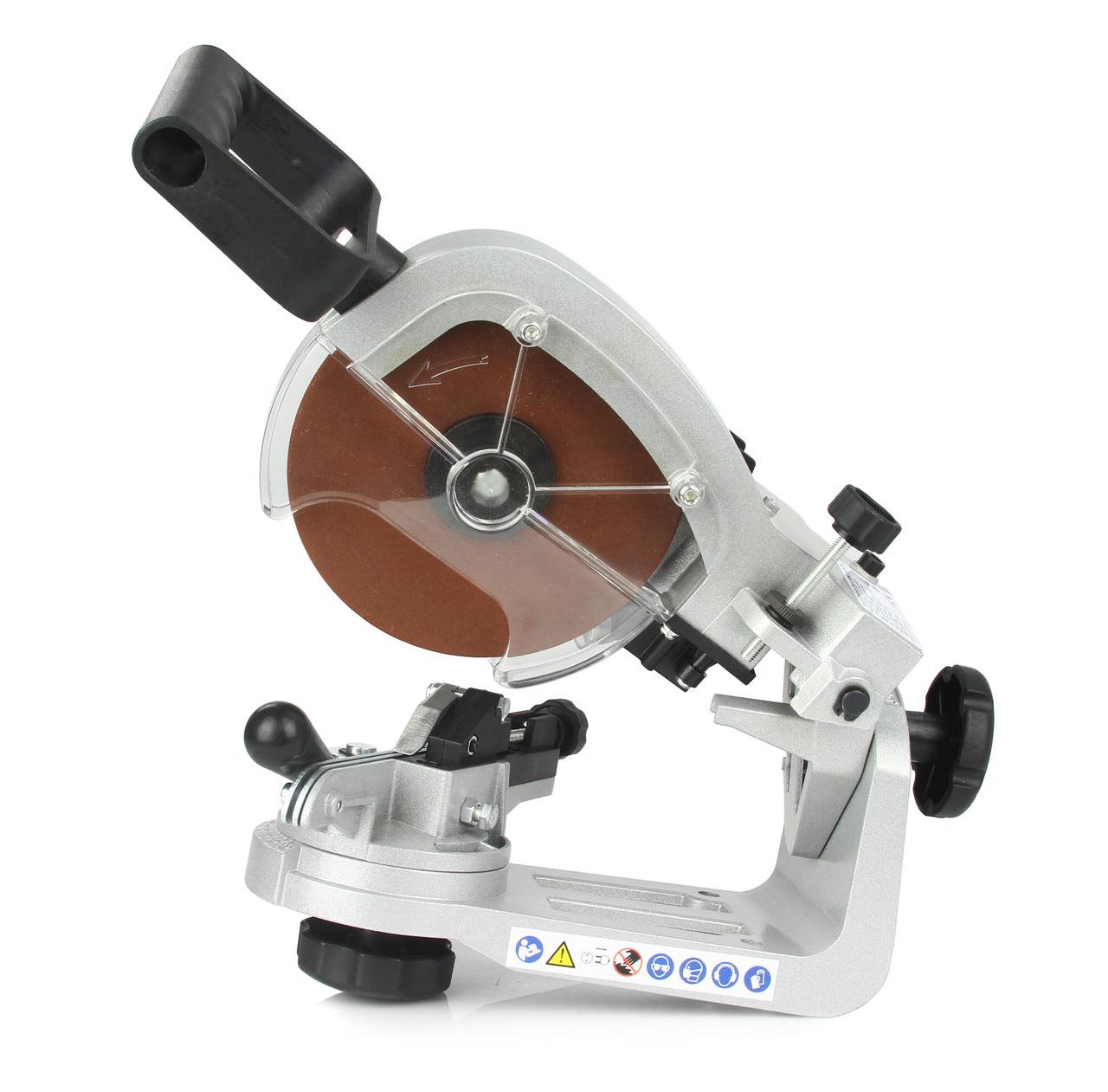 - Roți de șlefuit interschimbabile cu toate lanțurile obișnuite de ferăstrău menghină de prindere care se rotește la dreapta/stânga cu 30 de grade