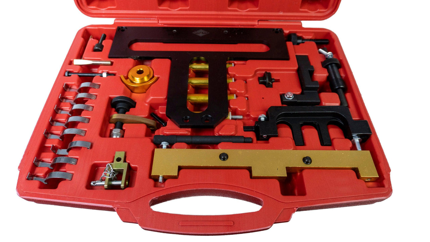 Set de Unelte pentru Sincronizarea Motorului pentru BMW Acest set de unelte pentru sincronizarea motorului este destinat motoarelor pe benzină cu 4 cilindri și două arbori cu came, cu capacități de 1.8 și 2.0 litri.