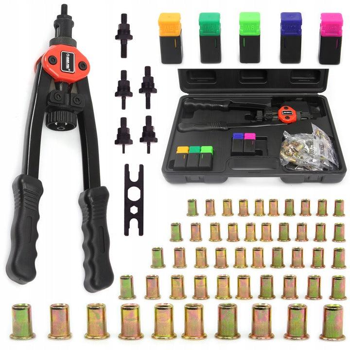 Unealtă cu piuliță nit fixată manual, ambalată într-o cutie practică din plastic.