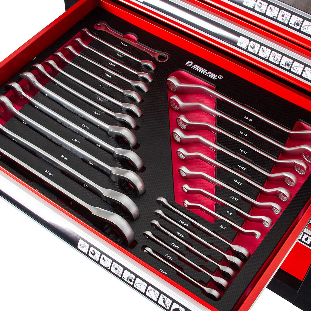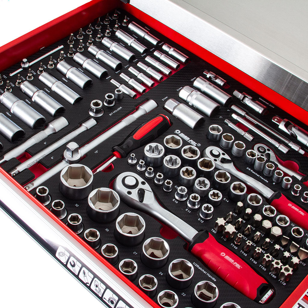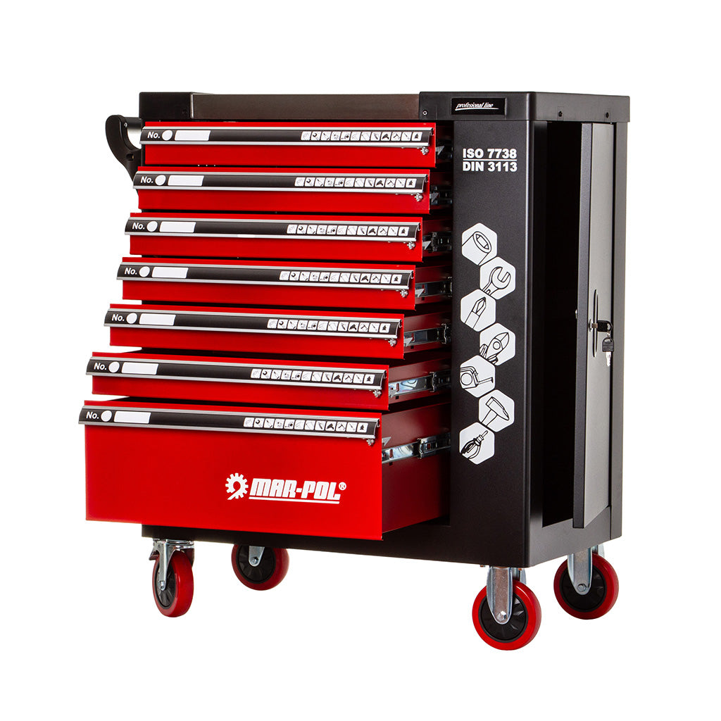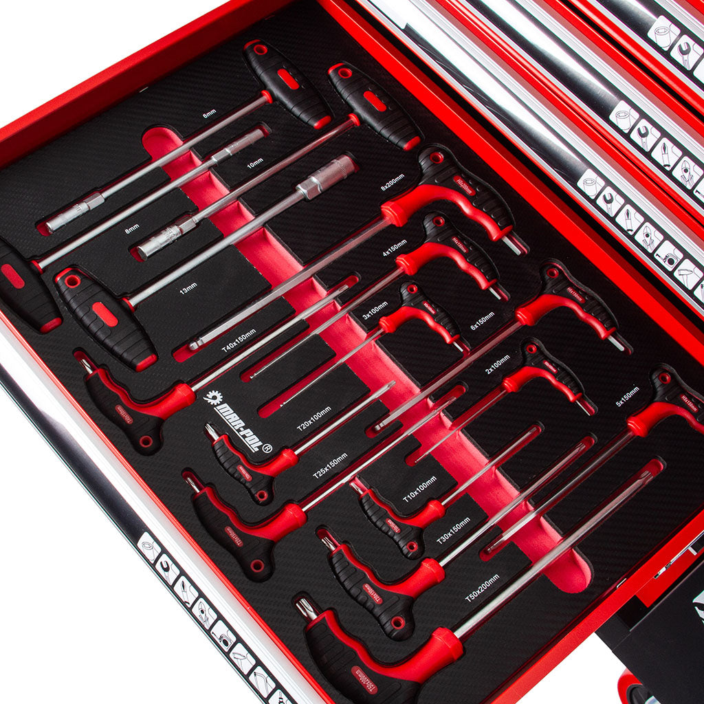 Acesta este un dulap-servant profesional mobil, destinat atelierelor, garajelor sau utilizării casnice exigente, cu un set complet de unelte (263 de piese) instalate în sertare.