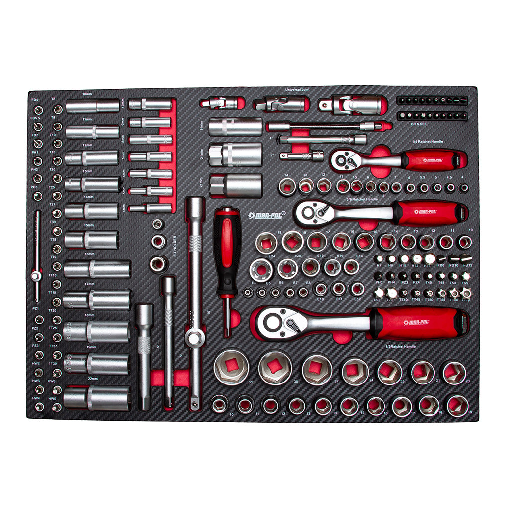 Include 263 piese: chei fixe-inel, chei cu clichet rapid (72 dinți, minim 5° pas de rotație), seturi de tubulare, șurubelnițe plat/cruce, etc. Fabricate din oțel Cr‑V (crom‑vanadiu)