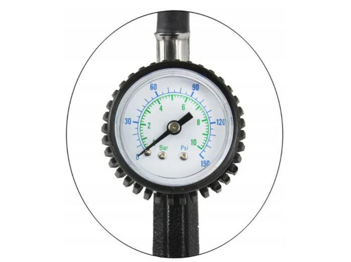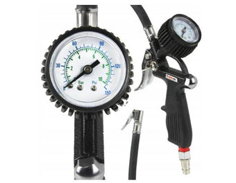 Pistol pneumatic pentru umflarea roților echipat cu un manometru clar albastru-verde max 10 bar / 150 psi Are un manometru mare, vizibil, fixat cu un capac de cauciuc care îl protejează de deteriorarea în timpul depunerii neglijent. Pistolul este echipat cu un cuplaj rapid standard folosit în instrumentele pneumatice europene. Perfect pentru pompare și controlul presiunii