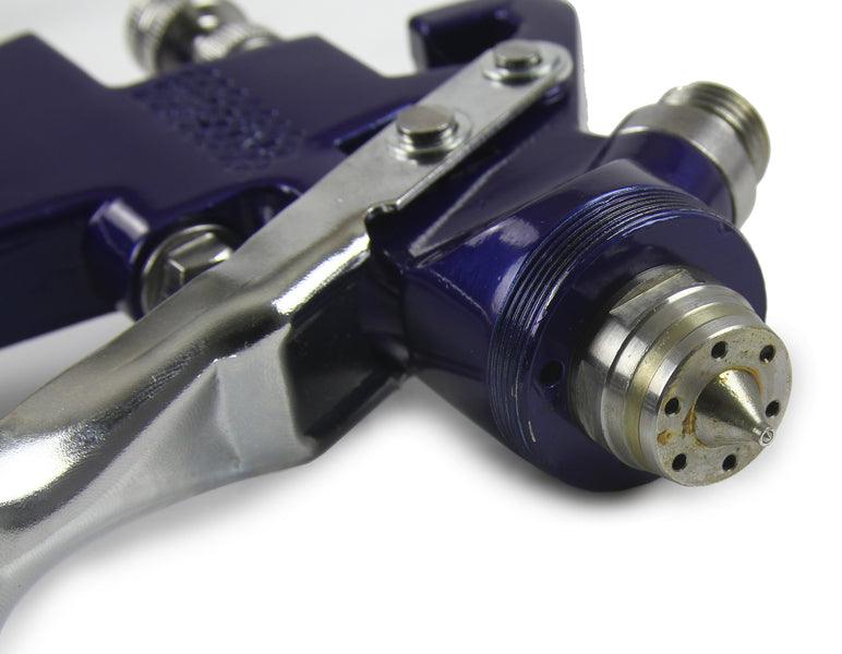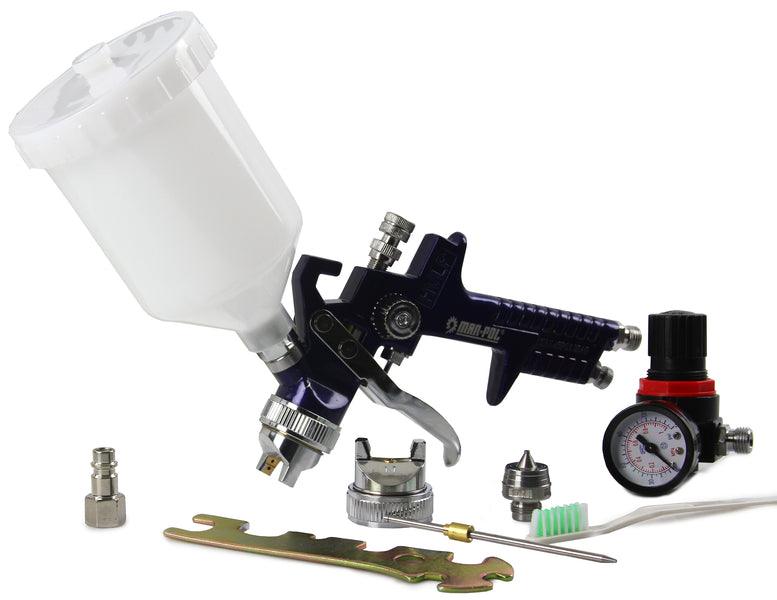 Tehnologia aplicată HVLP (High Volume Low Presure) permite obținerea unui volum mare de vopsea ejectată cu o presiune scăzută a aerului împingând vopseaua prin duză. Ca urmare, se pierde mai puțină vopsea cu aerul suflat și mai multe ploi pe suprafețele vopsite, ceea ce reduce consumul de vopsea. Butonul de reglare a pulverizării de pe partea laterală a corpului reglează dimensiunea sprayului de vopsea. Butonul de reglare a materialului vă permite să reglați cantitatea de vopsea suflată prin duză. Butonul de control al presiunii vă permite să reglați presiunea aerului care ajunge la pistol de la compresor. Setul include un reductor pentru conexiunea de 1/4 "cu un domeniu de presiune de 0 - 8 bar.