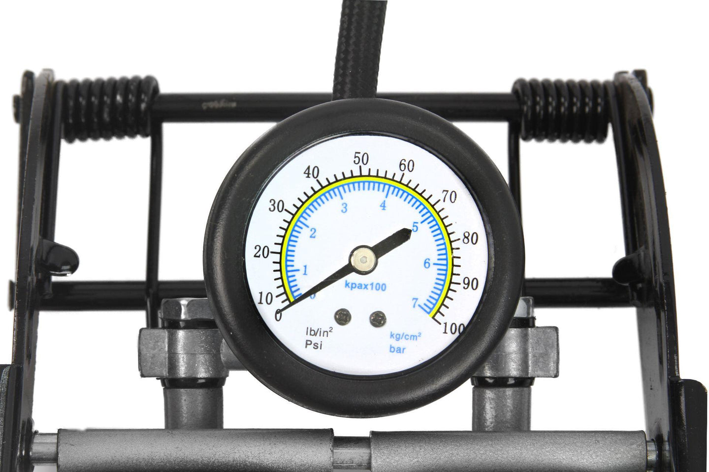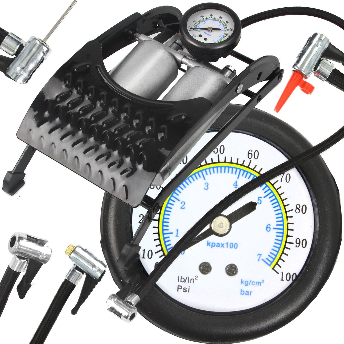 Pompă la picior cu manometru pentru pomparea mașinilor, bicicletelor, echipamentelor sportive și turistice.