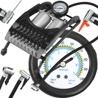 Echipat cu un manometru precis. Setul include si duze speciale pentru pomparea bile, saltele, biciclete etc.