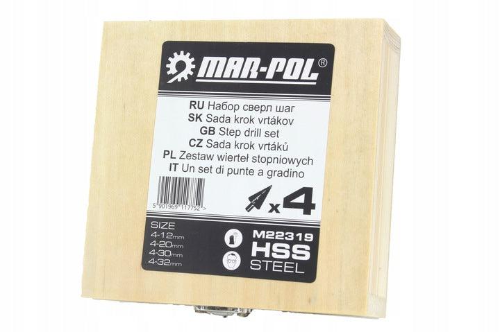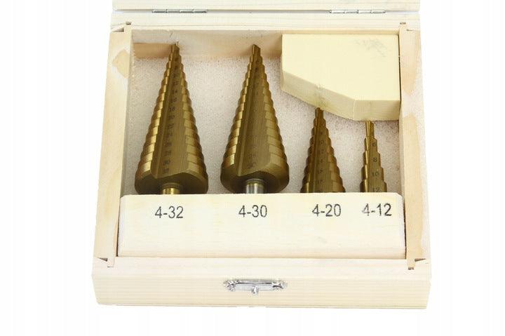 Set burghiu/burghie conic in trepte 4 piese HSS titan 4-32mm in cutie lemn