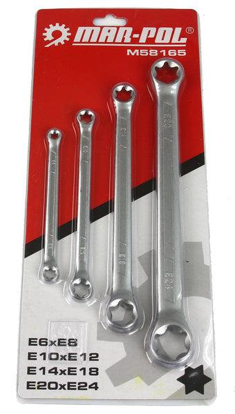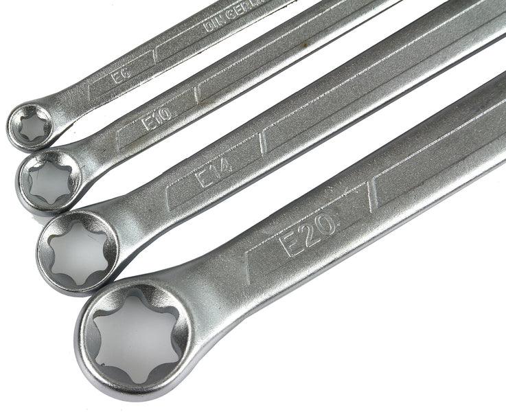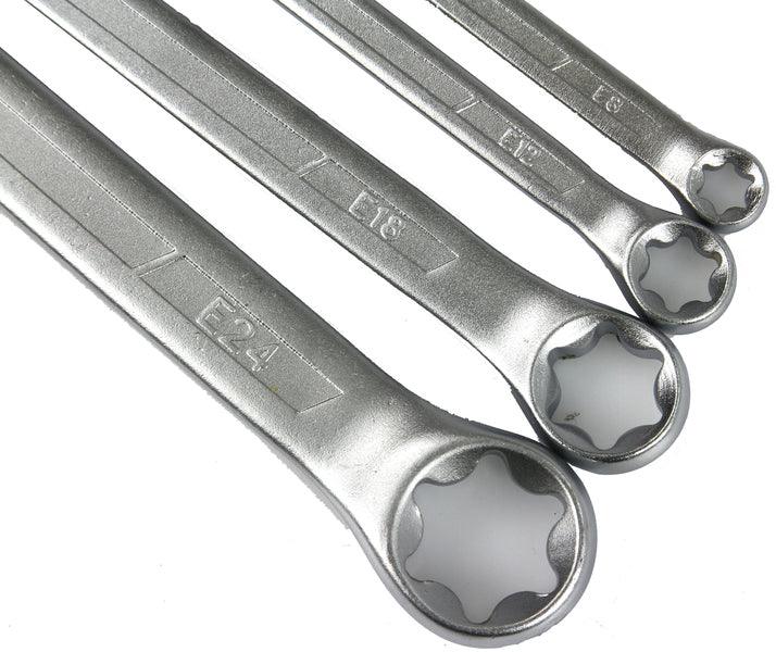 Chei inelare TORX, set de 4 piese, dimensiuni 6 - 24 mm. Chei din oțel CrV care garantează durată lungă de viață și fiabilitate. Chei torx fiabile și puternice pentru un transfer mai bun al cuplului de la cheile hexagonale. -