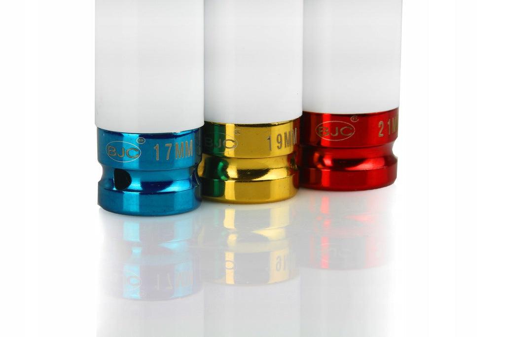 Set dedicat de prize de impact pentru jante din aliaj 17 19 21 mm în carcasă Mufe de impact profesionale, proiectate pentru deșurubarea sigură a jantelor din aliaj - au un ÎNVELIS SPECIAL care protejează janta împotriva zgârieturilor și deteriorării. Un set de prize din oțel pentru scule cu marcajul CrV, care se caracterizează prin durabilitate și fiabilitate ridicate . Fiecare dintre prize în CULORI INDIVIDUALE , permițând identificarea ușoară a dimensiunii. Soclurile sunt proiectate să funcționeze cu chei pneumatice de 1/2 "
