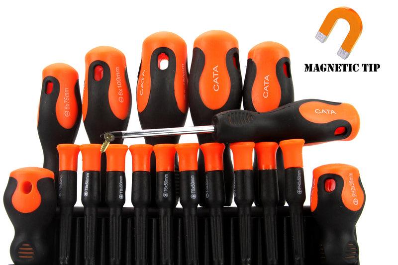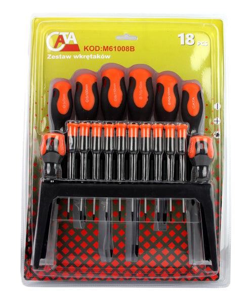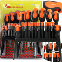 Capete magnetice Utilizarea vârfurilor magnetice în întregul set de șurubelnițe oferă posibilități și precizie mai mari de înșurubare în locuri greu accesibile Calitatea materialului Utilizarea de materiale de înaltă calitate, cum ar fi aliajul de crom vanadiu, la producerea șurubelnițelor, le extinde durata de viață și oferă o durabilitate mai mare. Cromul garantează rezistența oțelului la coroziune, oxidare, abraziune și rezistență ridicată la temperaturi ridicate. Adăugarea de vanadiu inhibă creșterea granulelor în timpul tratamentului termic, crescând în același timp ductilitatea atât a formelor întărite, cât și a celor temperate. Setul de șurubelnițe CATA va funcționa în orice garaj sau atelier. Standul inclus facilitează depozitarea șurubelnițelor. Pe partea din spate a suportului, există 2 găuri de montare care permit agățarea întregului set pe perete.